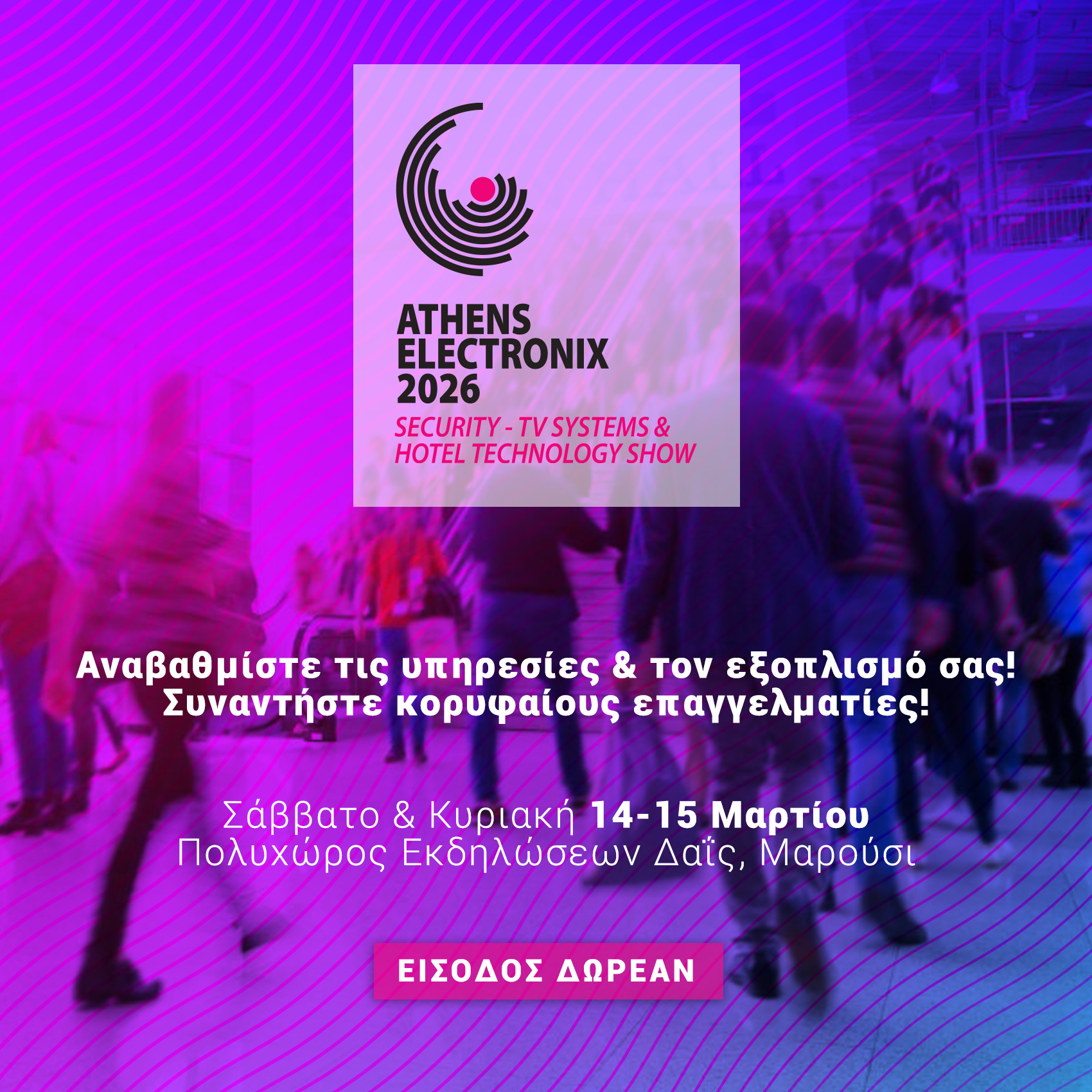 Δύο χρόνια μετά την Athens Electronix 2024 και έχοντας έκτοτε διοργανώσει δύο επιτυχημένες εκθέσεις σε Κρήτη και Θεσσαλονίκη, η κλαδική έκθεση Athens Electronix επιστρέφει στην Αθήνα! Η 4η έκθεση συστημάτων ασφαλείας, τηλεόρασης, δικτύων και τεχνολογίας ξενοδοχείων που θα διεξαχθεί στην πρωτεύουσα είναι γεγονός και θα λάβει χώρα στις 14 και 15 Μαρτίου 2026 στον Πολυχώρο Εκδηλώσεων Δαΐς, με ωράριο λειτουργίας το Σάββατο 09:30-18:30 και την Κυριακή 10:00-18:00.