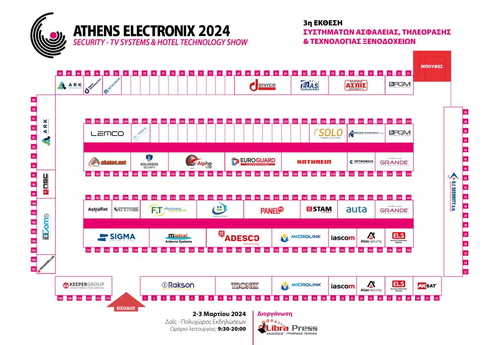 Οι εταιρείες που έχουν δηλώσει τη συμμετοχή τους στην έκθεσή μας είναι με αλφαβητική σειρά οι: Adesco, akatos.net, Alpha LTD, Alpha ΑΣΠΙΣ Security, ARK, AstraSat, Atlas Security, Auta Hellas, Axsat, Digital Innovations, Divico, Elasys, ELS | Security & Automation Solutions, Euroguard, FT Electronics, G.I. Security, Grande Security Α.Ε., Iascom, IDComs, Kathrein Hellas (ΛΥΡΑ ΑΕΒΕ), Keeper Group, Kolossos Security, Lemco, Microlink, Mistral Antenna Systems, Netacmion, NSC Hellas, Optronics, Panel TV, PGM, Rakson, SatStore, Shop4Security, Sigma Security, Solo Security, Stam Electronics, Tecnohellas, TIS – HBES, Tronix, Ψηφιακή Τεχνολογία.